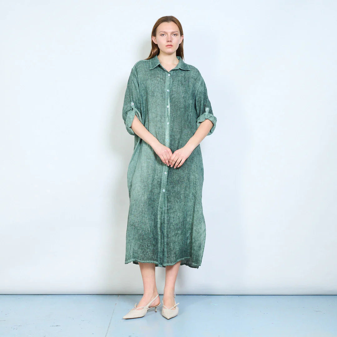 Abito da donna stile chemisier dalla linea morbida e femminile, perfetto per look quotidiani e da viaggio. Il modello presenta colletto classico, chiusura frontale con bottoni e maniche a 3/4 con linguetta per portarle arrotolate con facilità.