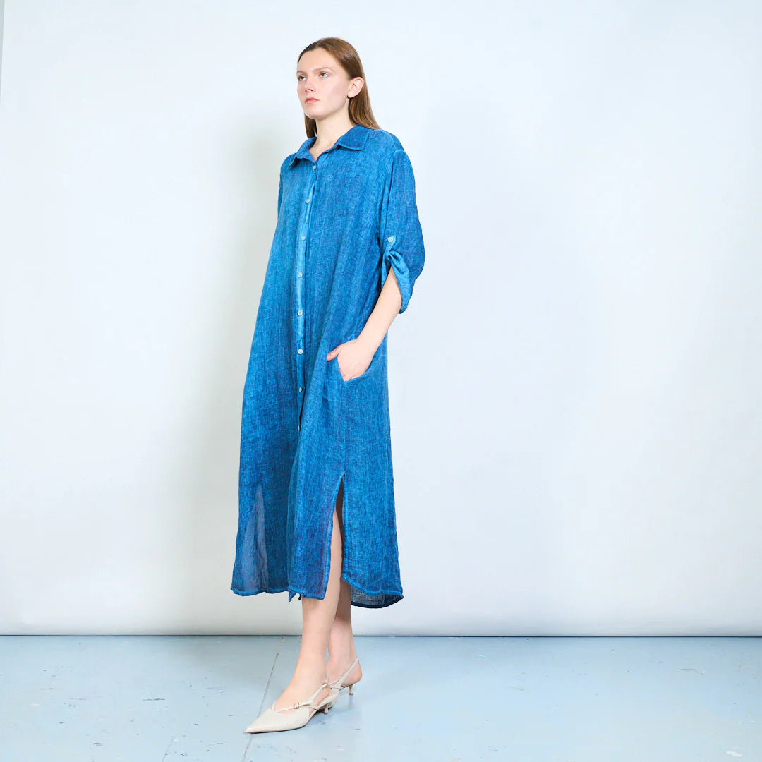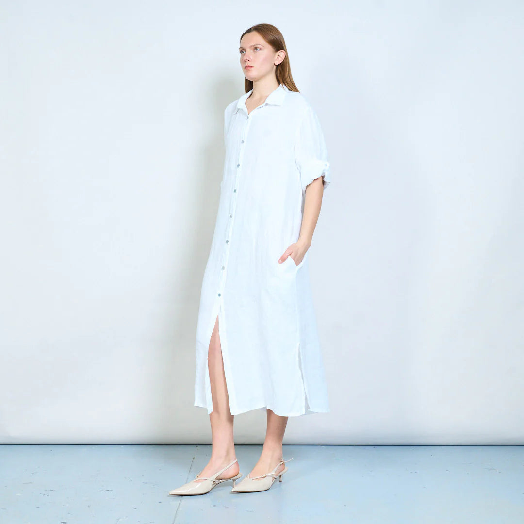 La lunghezza midi e gli spacchi laterali garantiscono comfort e libertà di movimento, mentre le tasche laterali aggiungono praticità. Ideale da indossare da solo, con sandali, sneakers o cintura in vita per definire la silhouette.