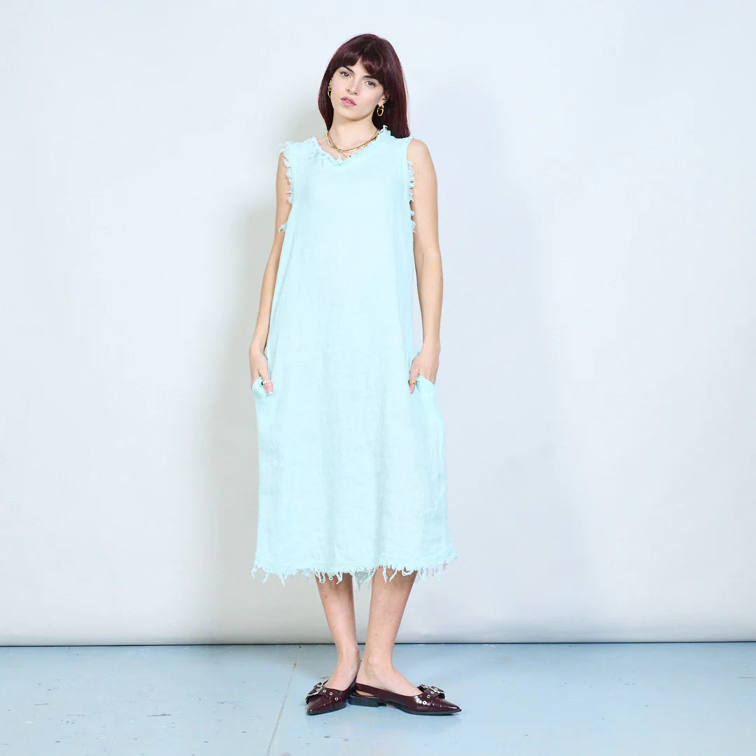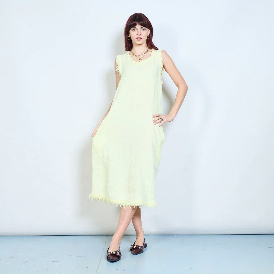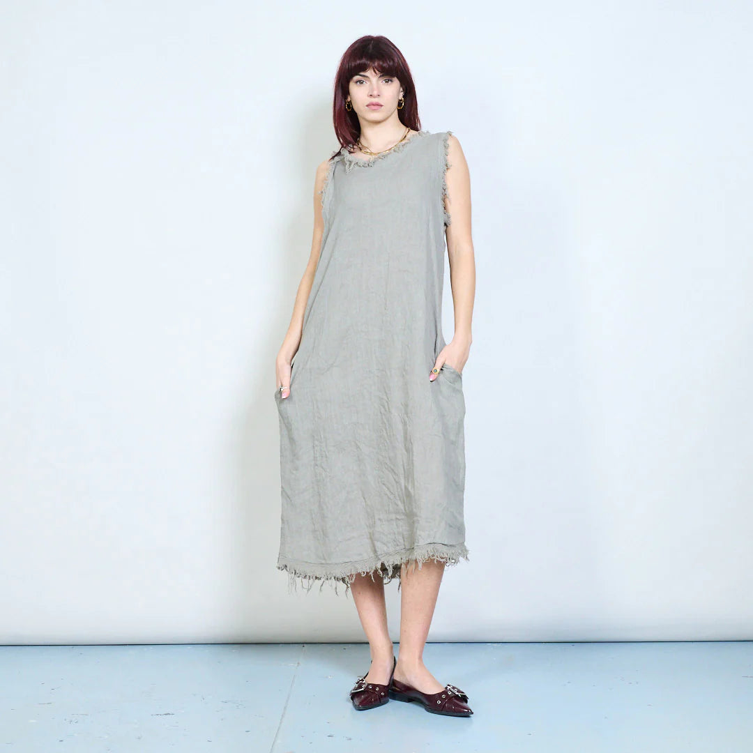 Abito midi smanicato in lino con bordi sfrangiati e tasche