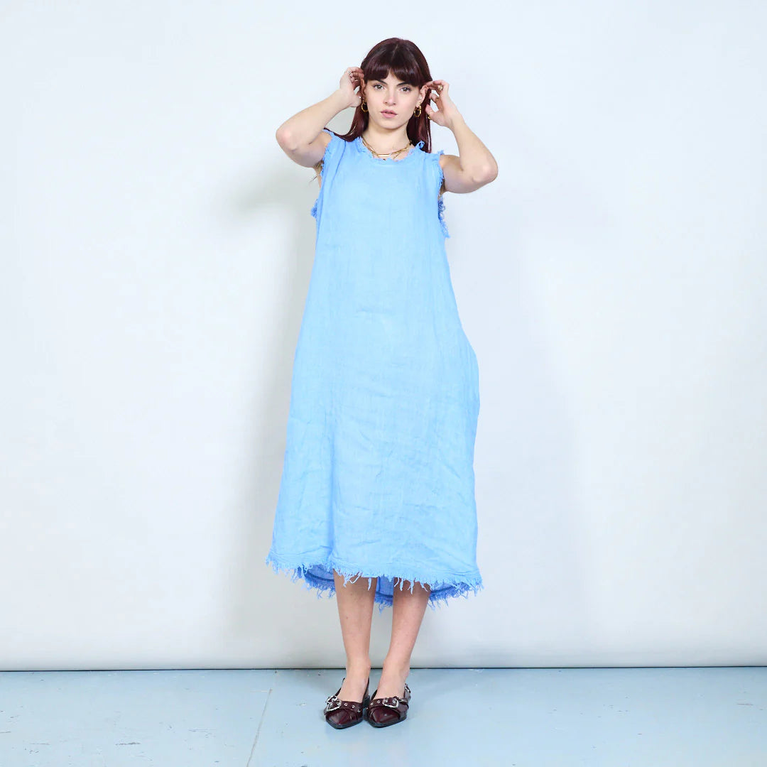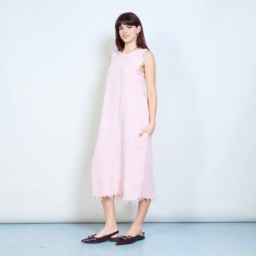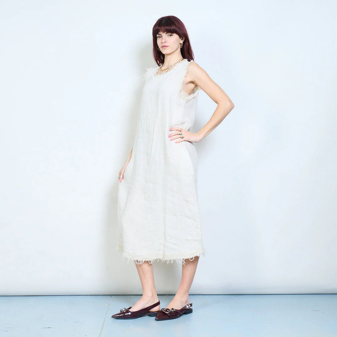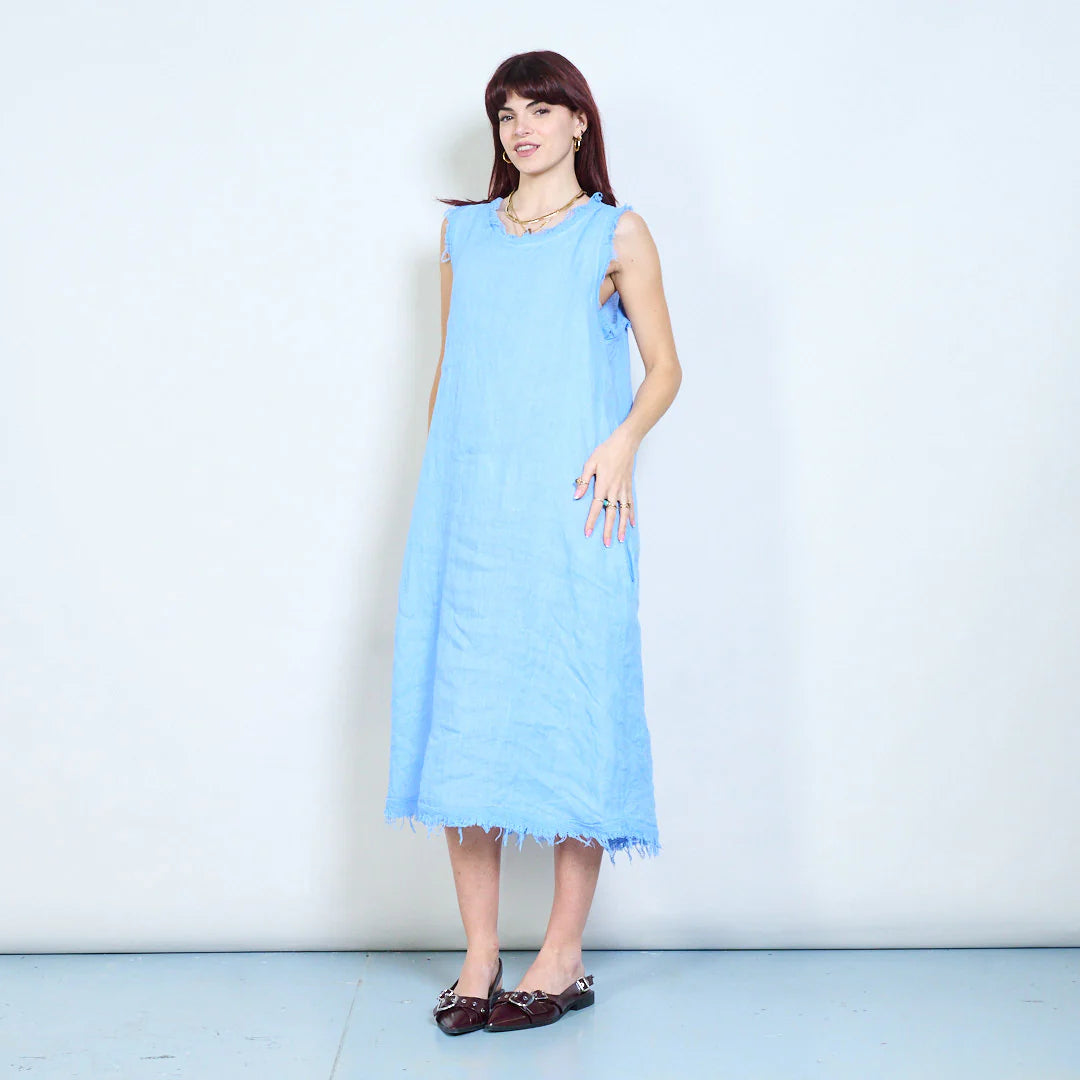 Abito midi smanicato in lino con bordi sfrangiati e tasche