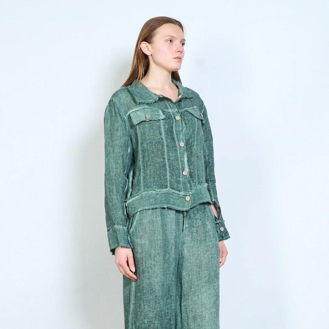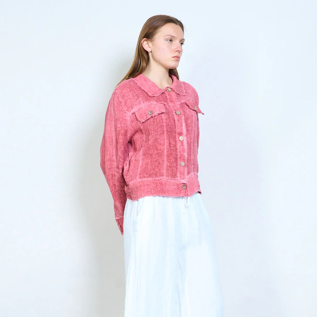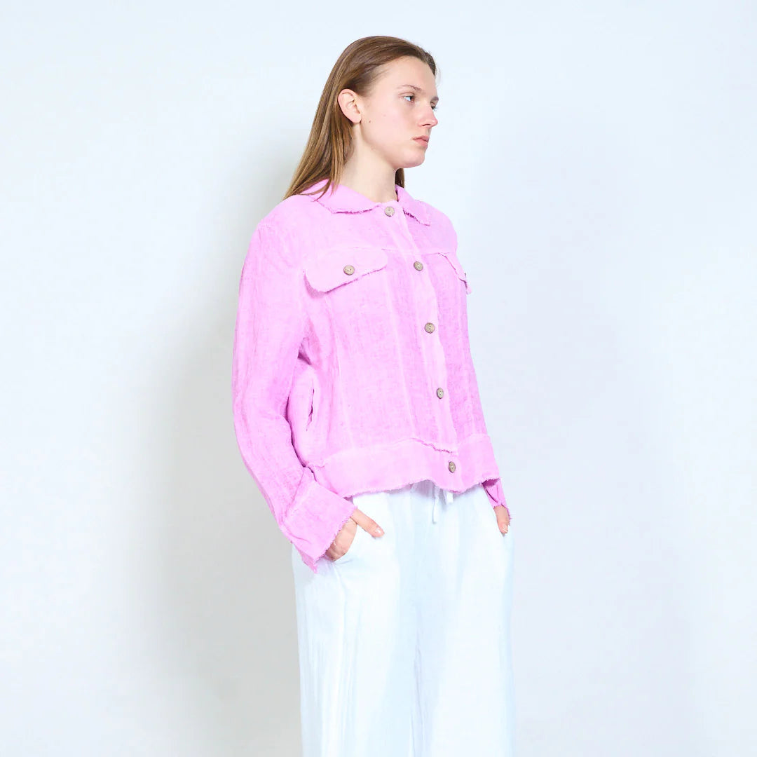 Le finiture con bordo vivo donano un effetto contemporaneo e leggermente “raw”, perfetto per outfit quotidiani e per la mezza stagione. Facile da abbinare a pantaloni, gonne o abiti leggeri, è un capo passe-partout che completa qualsiasi look con semplicità.