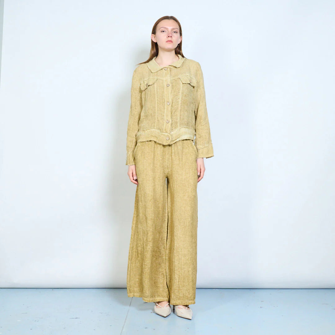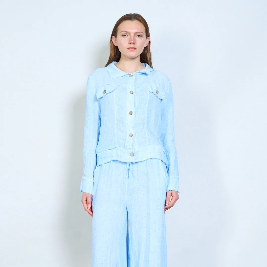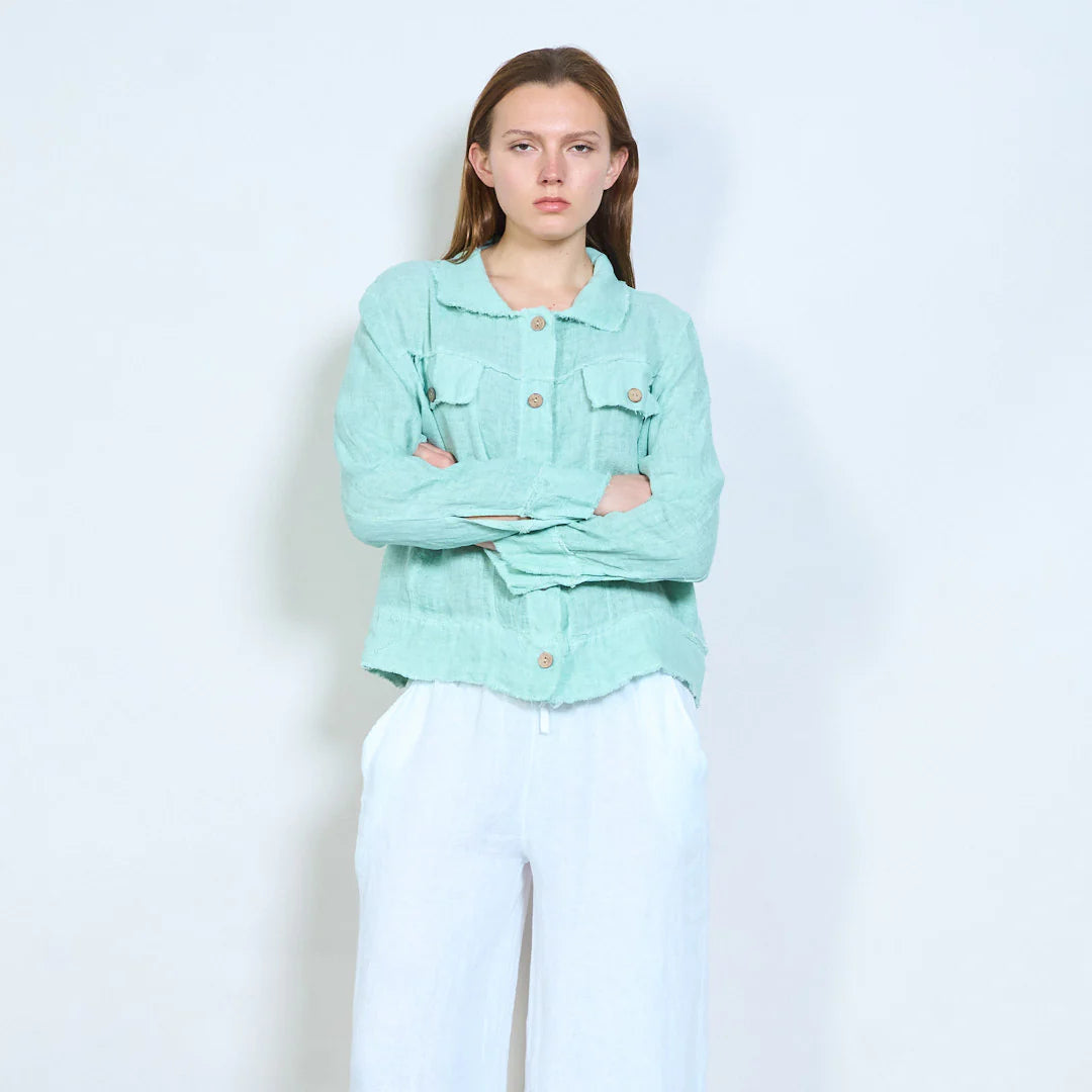 Le finiture con bordo vivo donano un effetto contemporaneo e leggermente “raw”, perfetto per outfit quotidiani e per la mezza stagione. Facile da abbinare a pantaloni, gonne o abiti leggeri, è un capo passe-partout che completa qualsiasi look con semplicità.