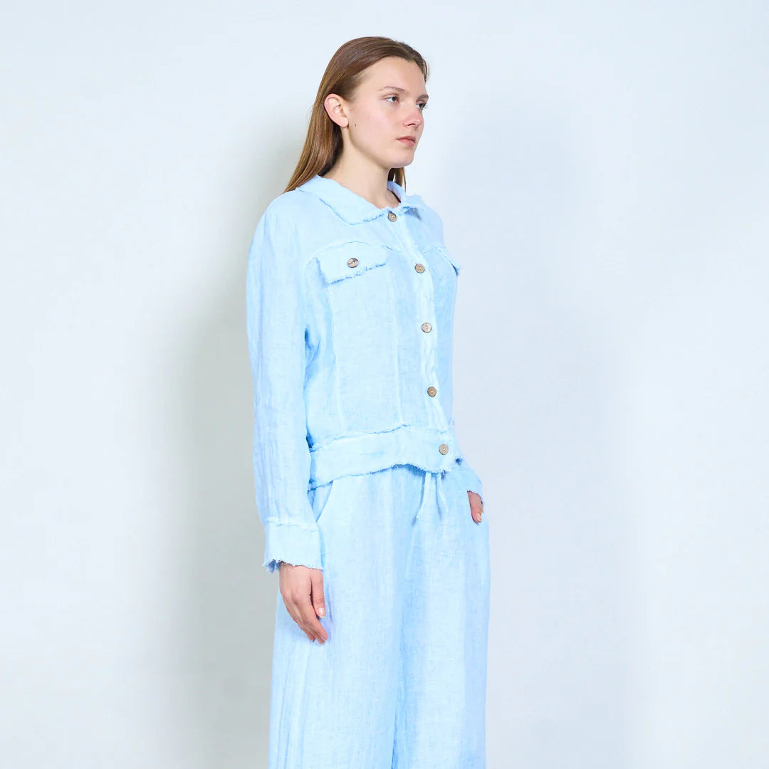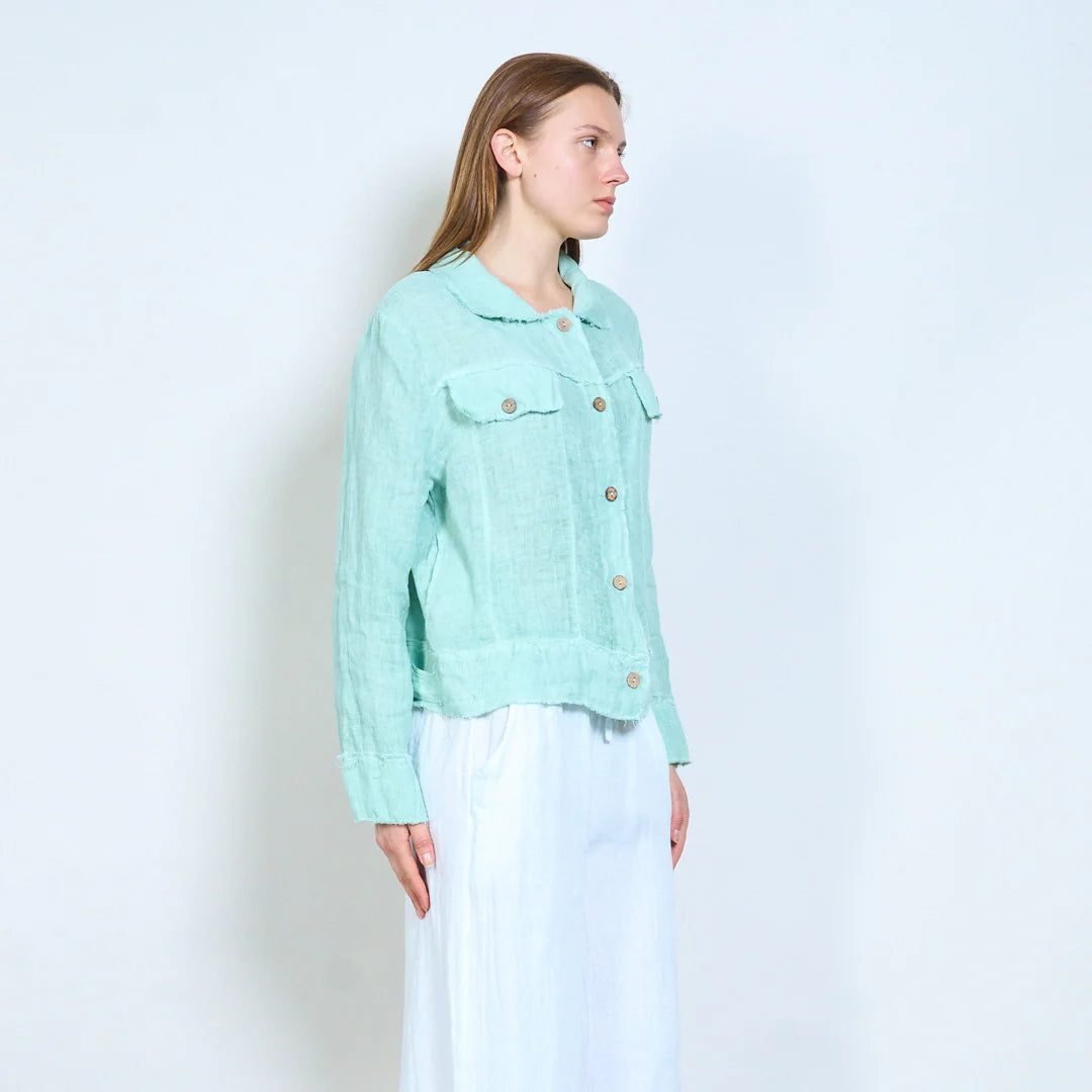 Giacca da donna dal taglio corto e versatile, realizzata in tessuto naturale dall’aspetto leggermente stropicciato. Il modello presenta colletto classico, chiusura frontale con bottoni e due tasche applicate sul petto con patta, per un look casual e curato.