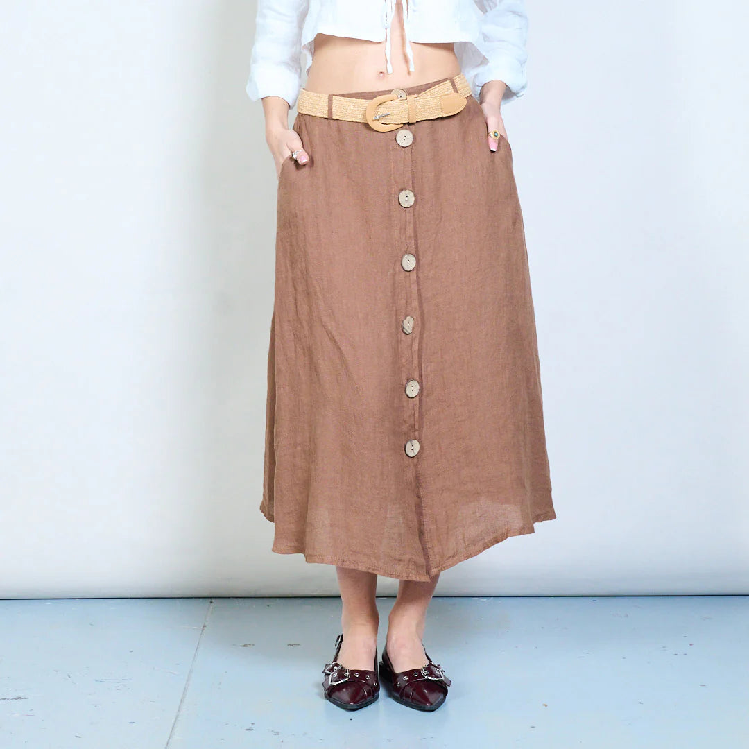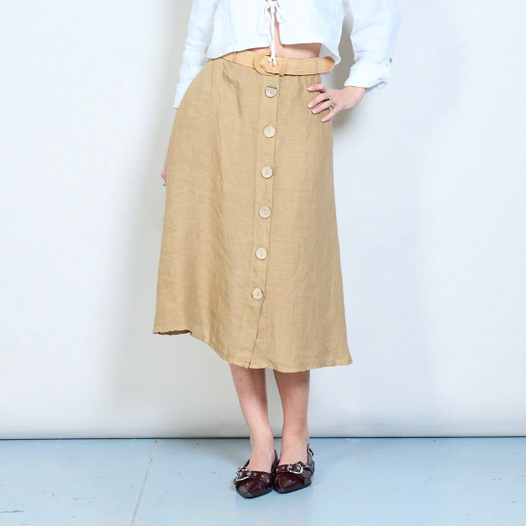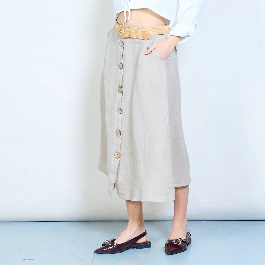 Gonna midi da donna dal design essenziale e raffinato, caratterizzata da chiusura frontale con bottoni a vista che slanciano la figura e aggiungono un dettaglio naturale e contemporaneo. La linea leggermente svasata garantisce movimento e comfort, mentre la vita regolare valorizza la silhouette.