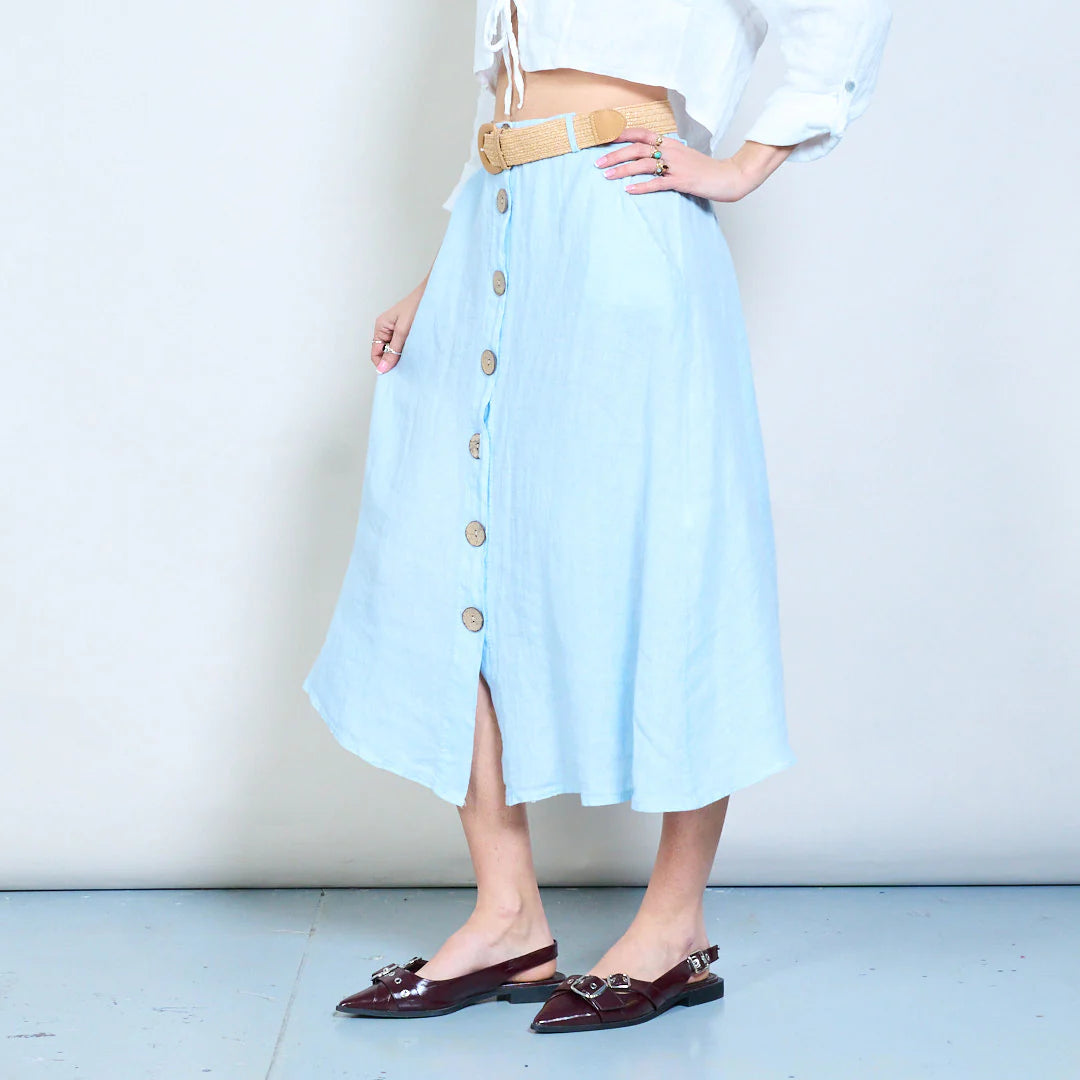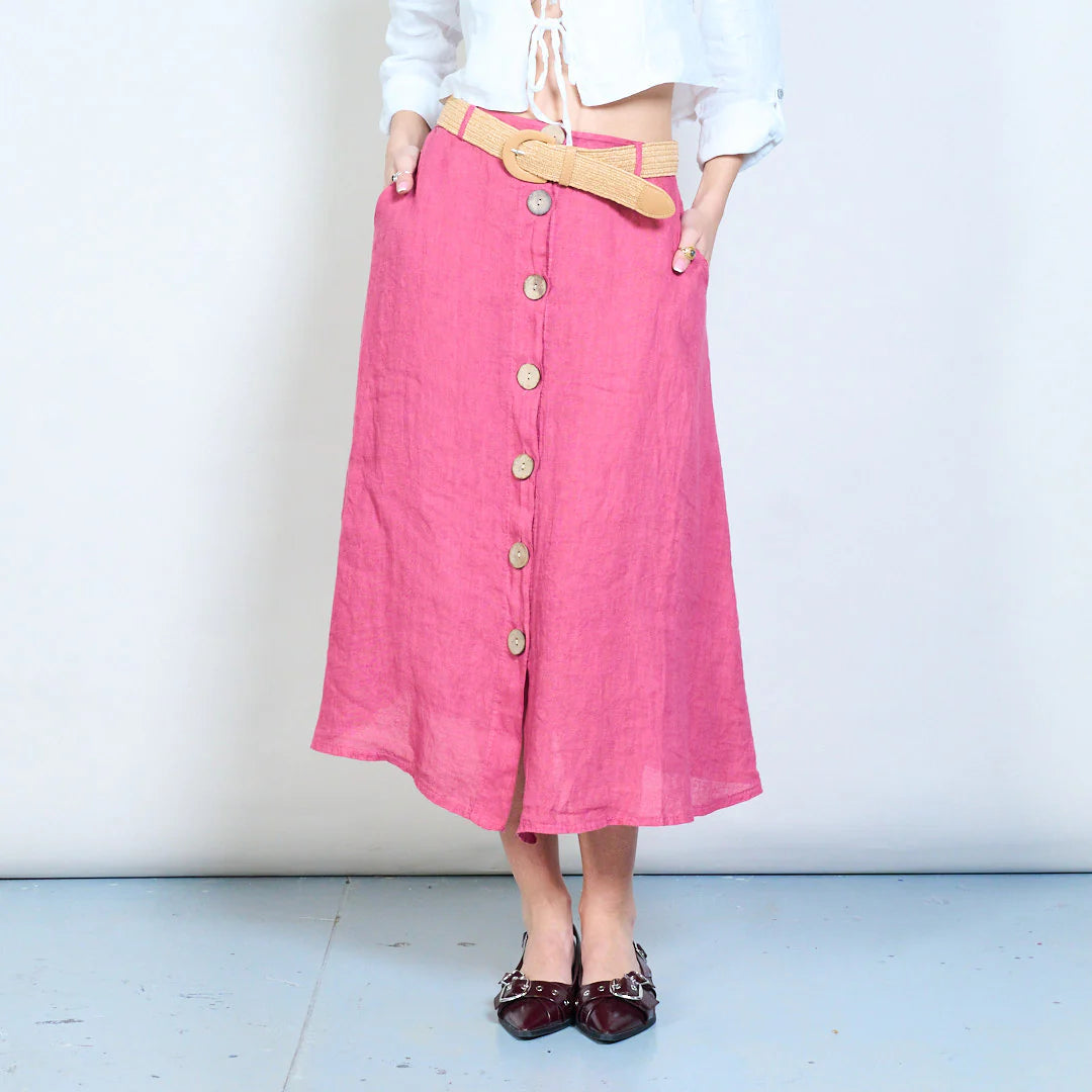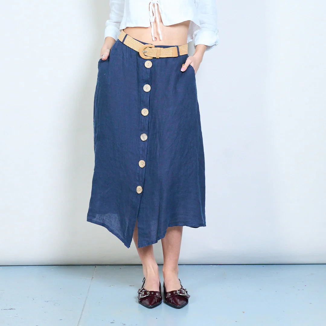 Gonna midi da donna dal design essenziale e raffinato, caratterizzata da chiusura frontale con bottoni a vista che slanciano la figura e aggiungono un dettaglio naturale e contemporaneo. La linea leggermente svasata garantisce movimento e comfort, mentre la vita regolare valorizza la silhouette.
