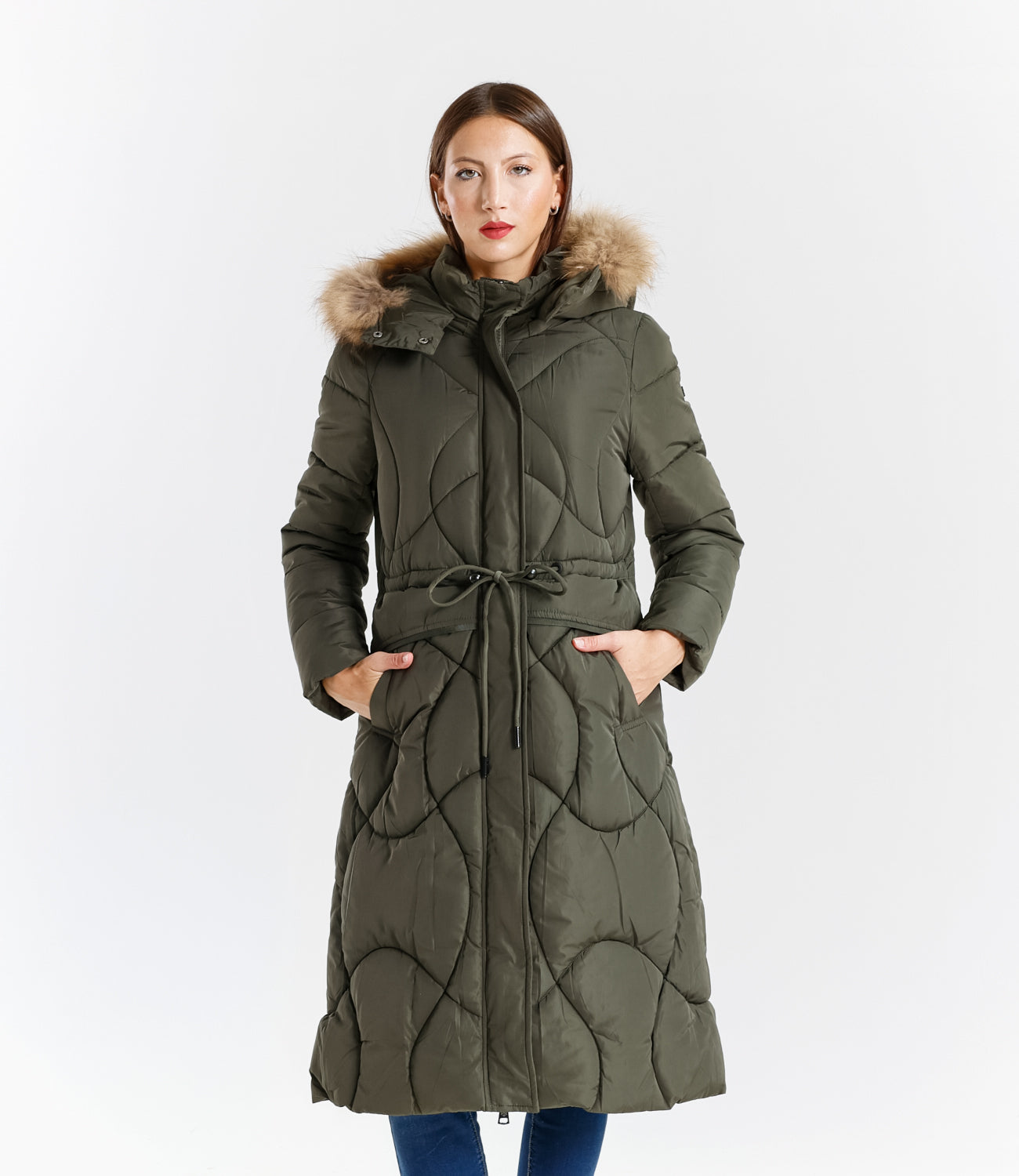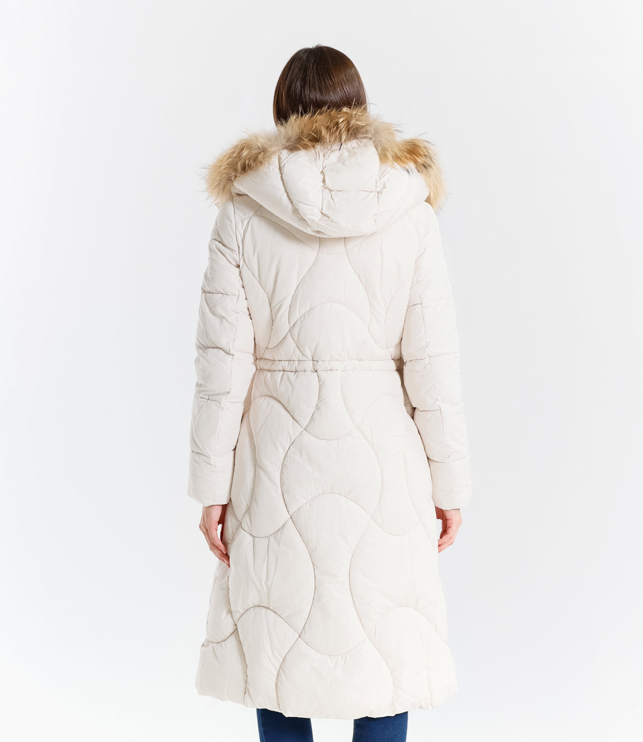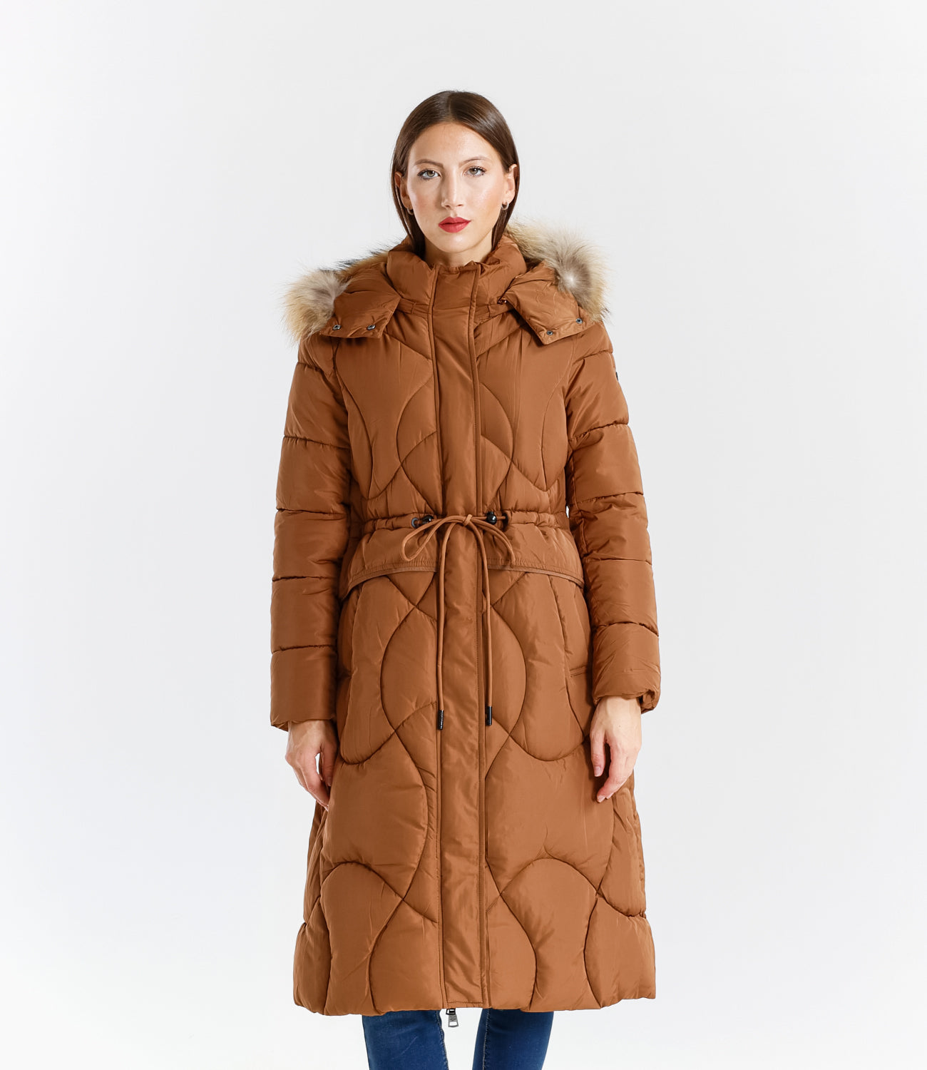 Piumino lungo donna con cappuccio e bordo in pelliccia vera staccabile