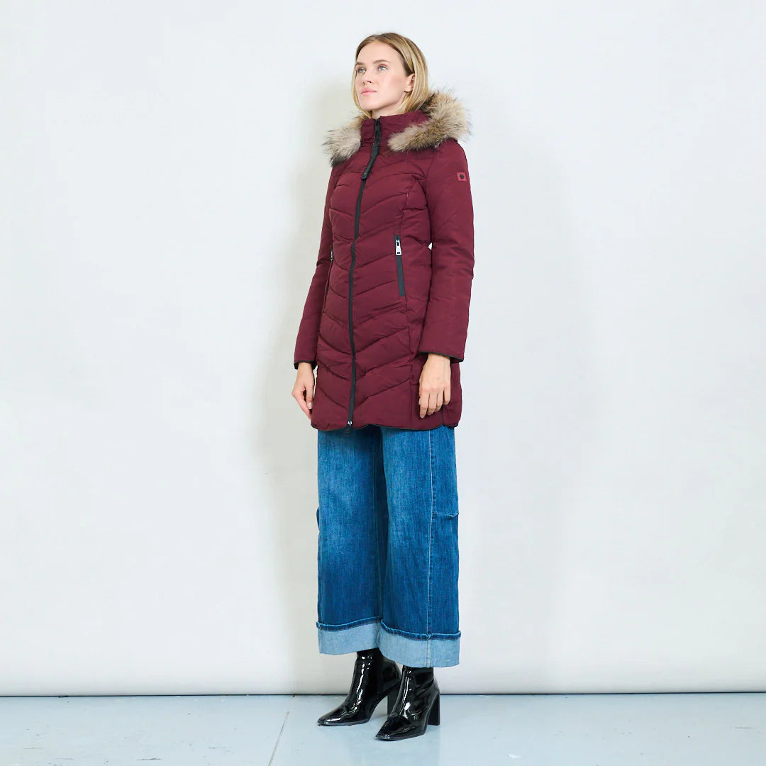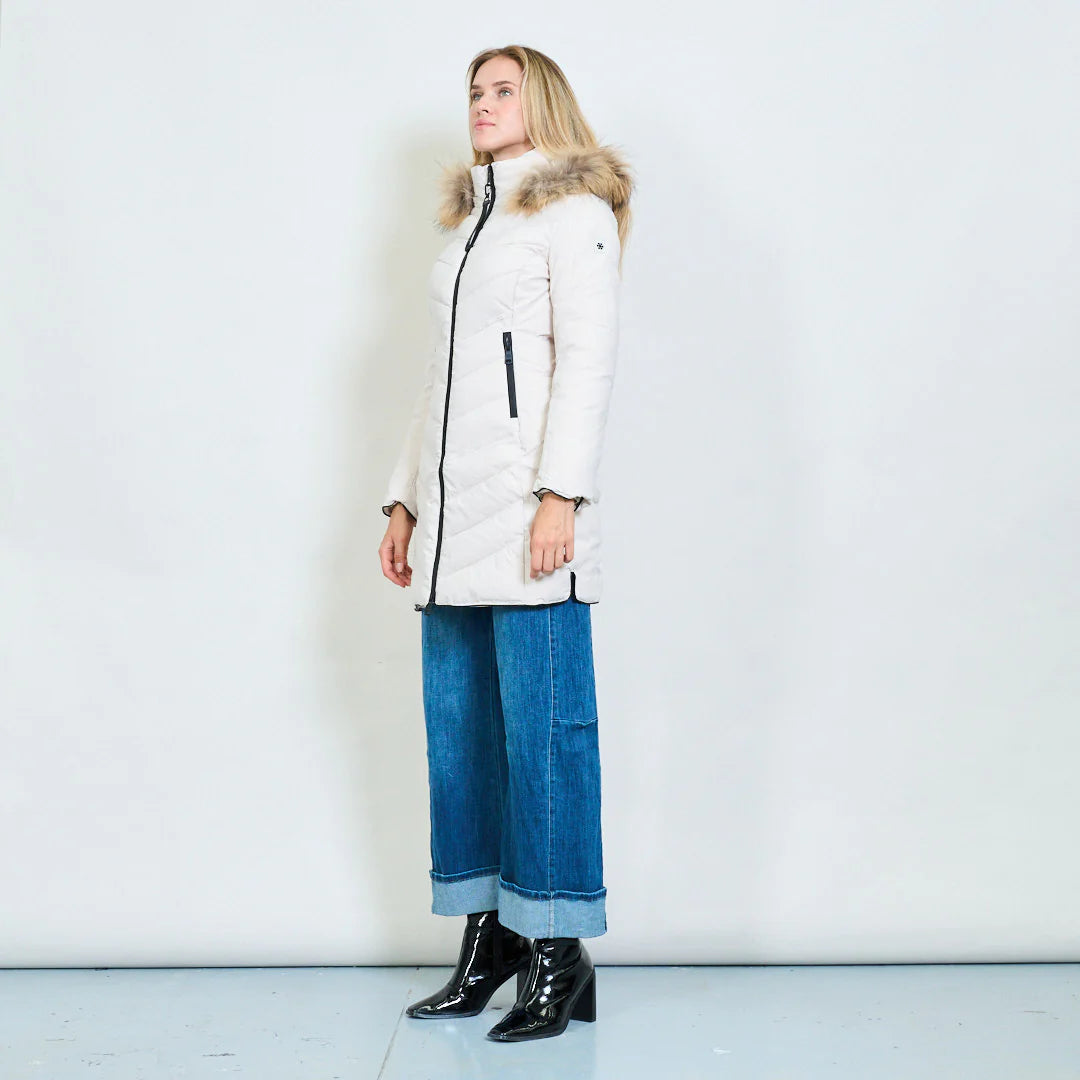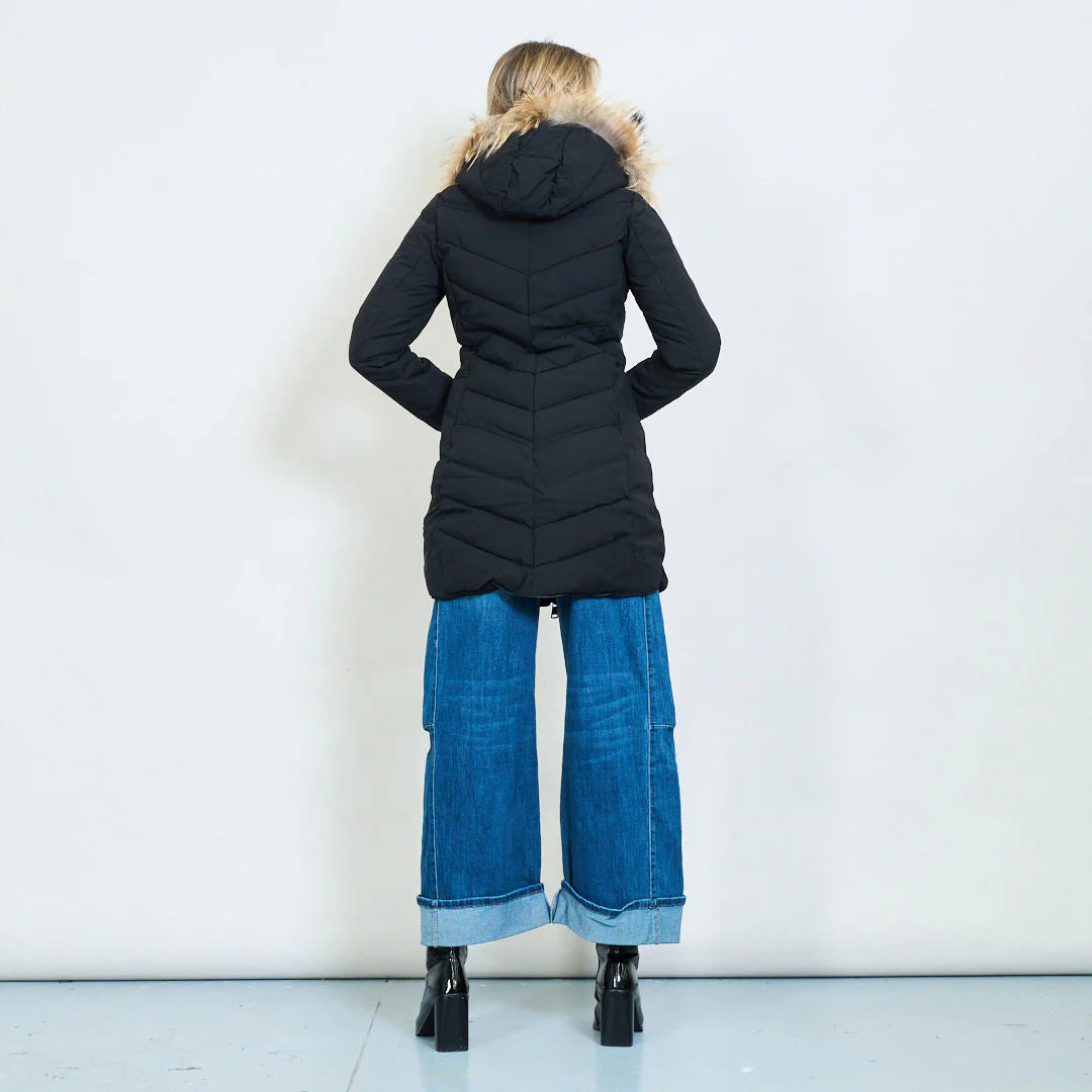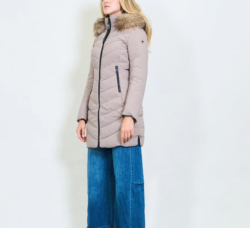 Women's medium-length down jacket in military green with a slim fit and a hood trimmed with real rabbit fur. Warm, lightweight, and refined, it's ideal for facing cold days in style. The quilted design flatters the figure, and the zip pockets add a modern and practical touch.